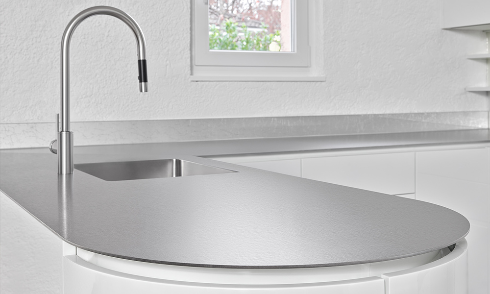 1 Material, 1000 Möglichkeiten. Arbeitsplatten aus Edelstahl verbinden Funktionalität mit gestalterischer Vielfalt. Schliff und Finish machen aus dem Material echte Unikate, die Räume prägen.