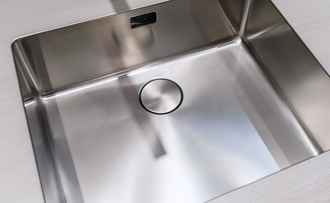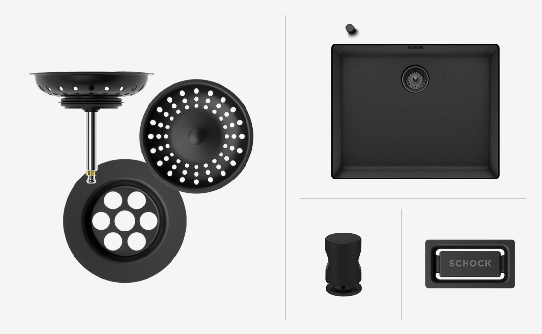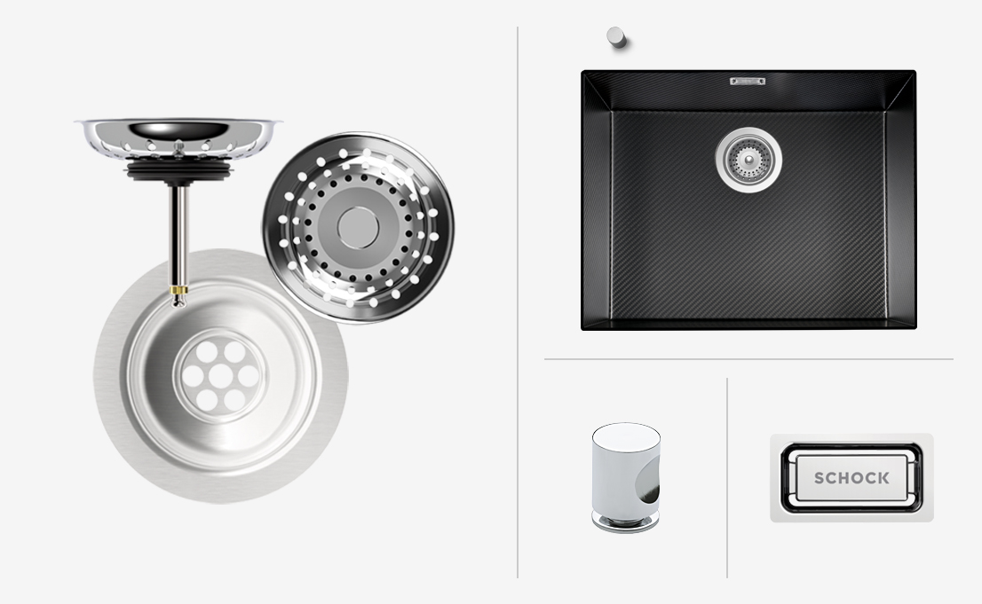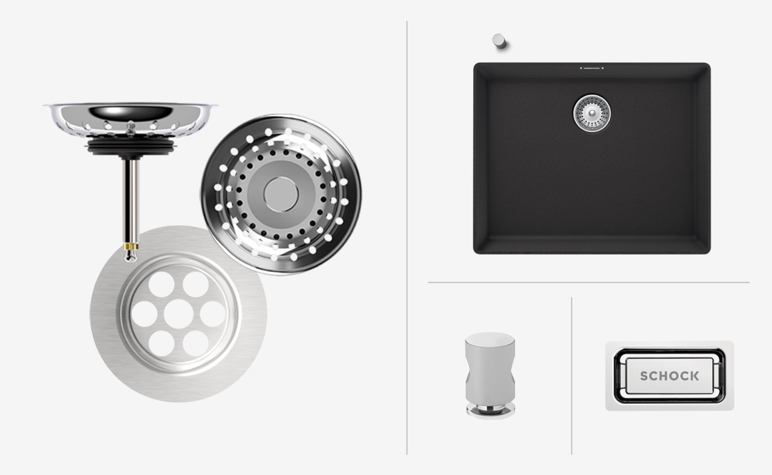 Spülen und Becken der Marke Schock in der Bedienvariante Raumspar sind mit einem Siebeinsatz sowie einem Zug- oder Drehknopf zur Steuerung des Ablaufs ausgestattet.