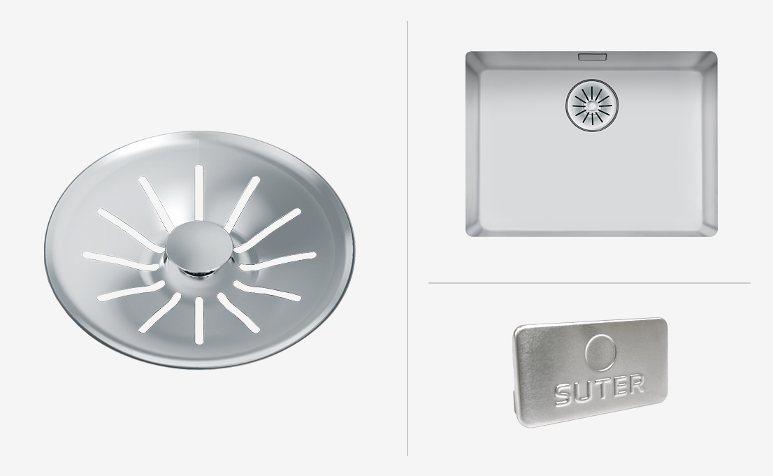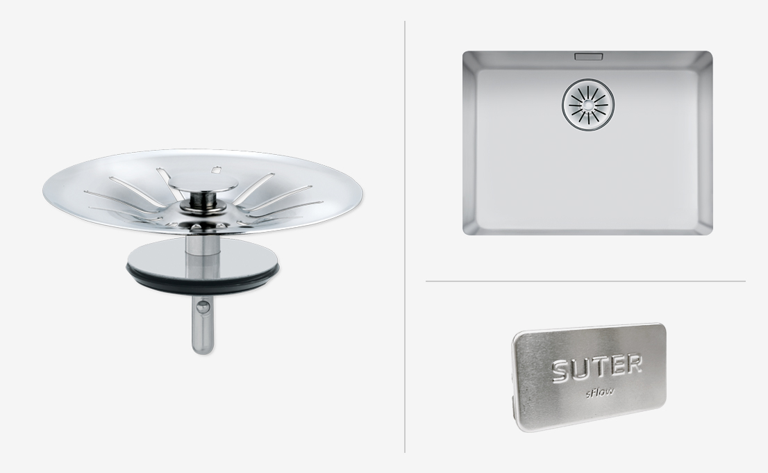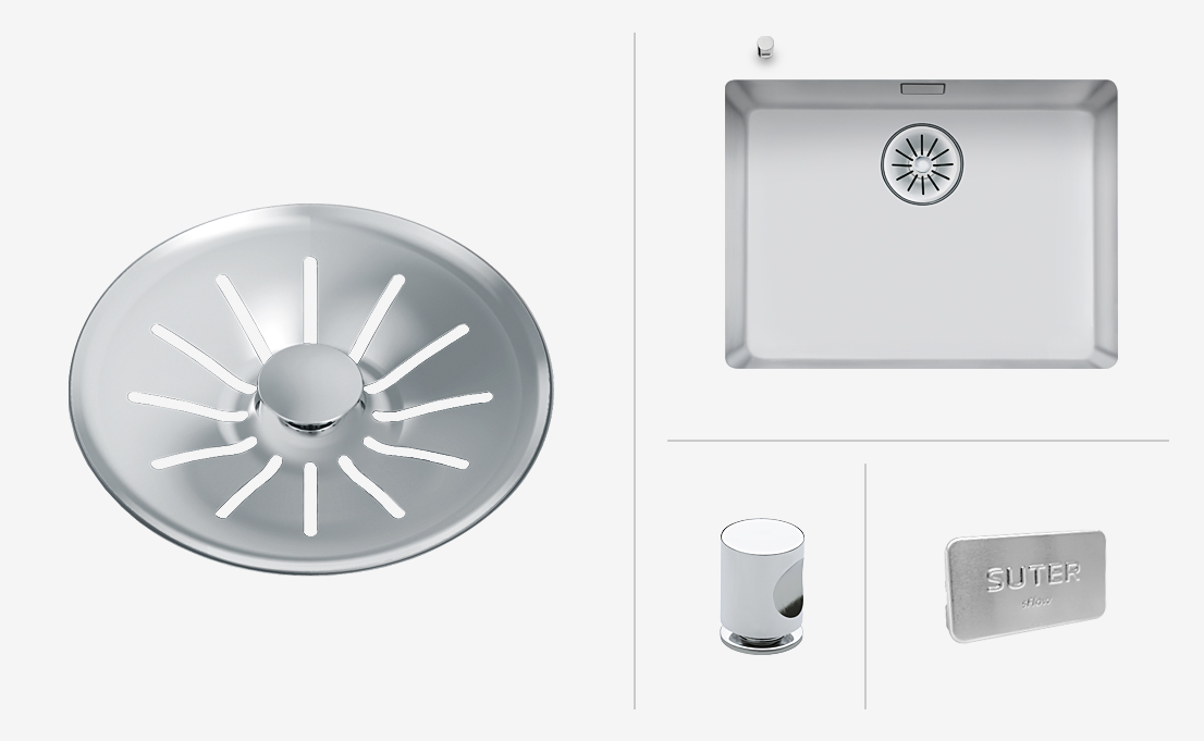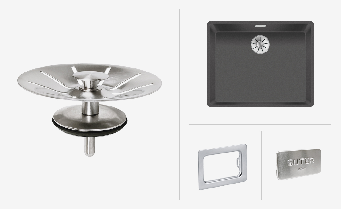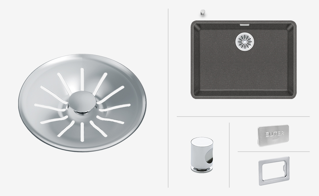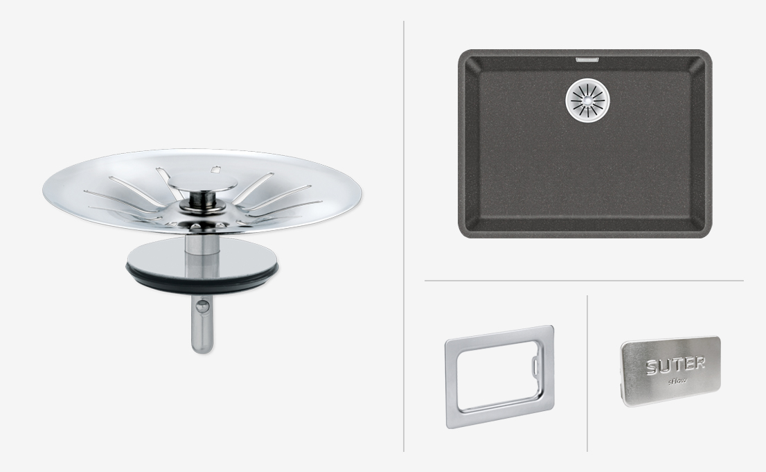 Ergänzt wird das Wasserzentrum durch einen Siebkorb und einen verdeckten Überlauf. Je nach Becken- oder Spülenmodell unterscheiden sich diese in Form und Farbe.