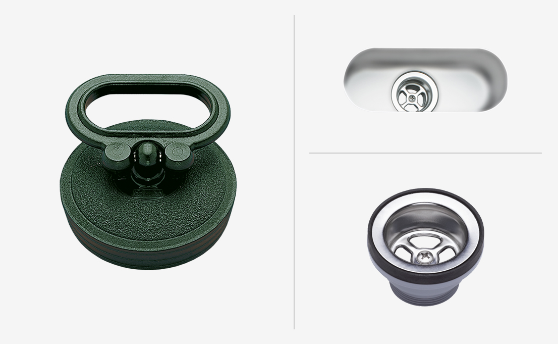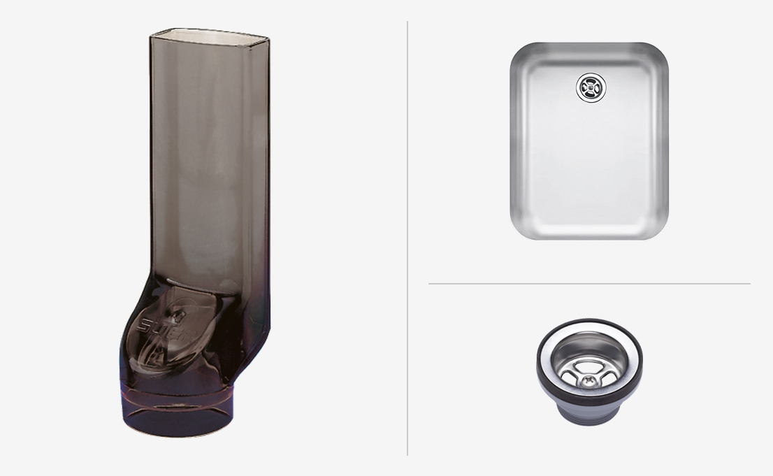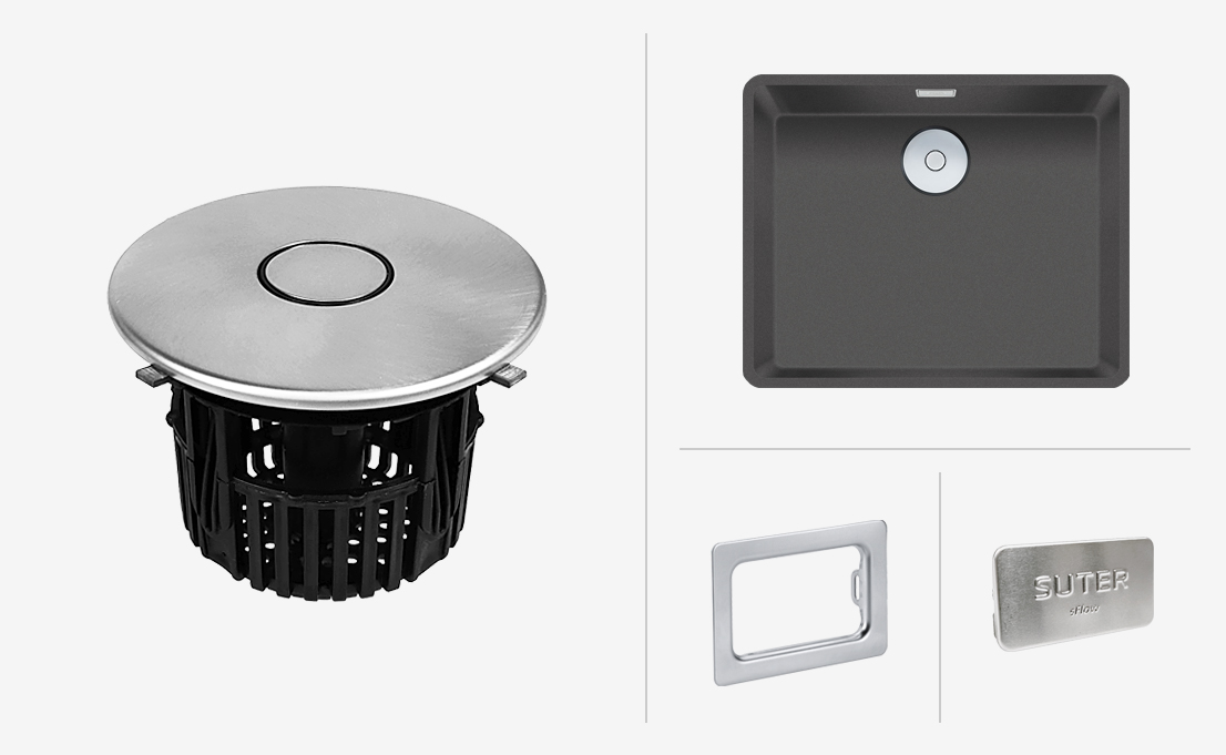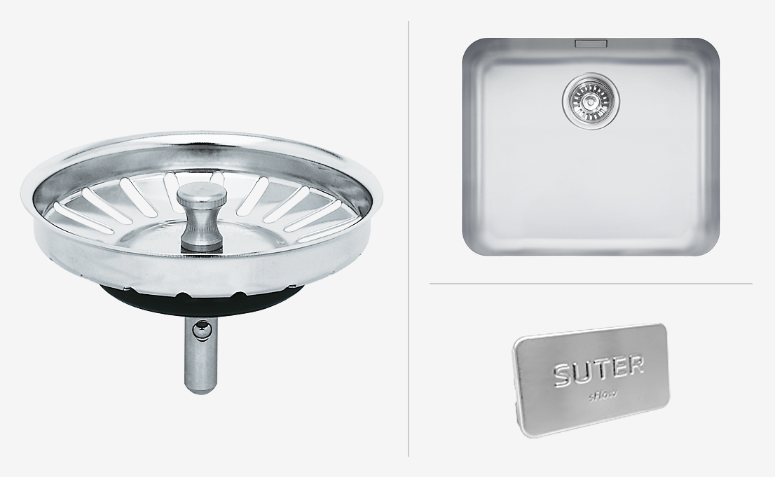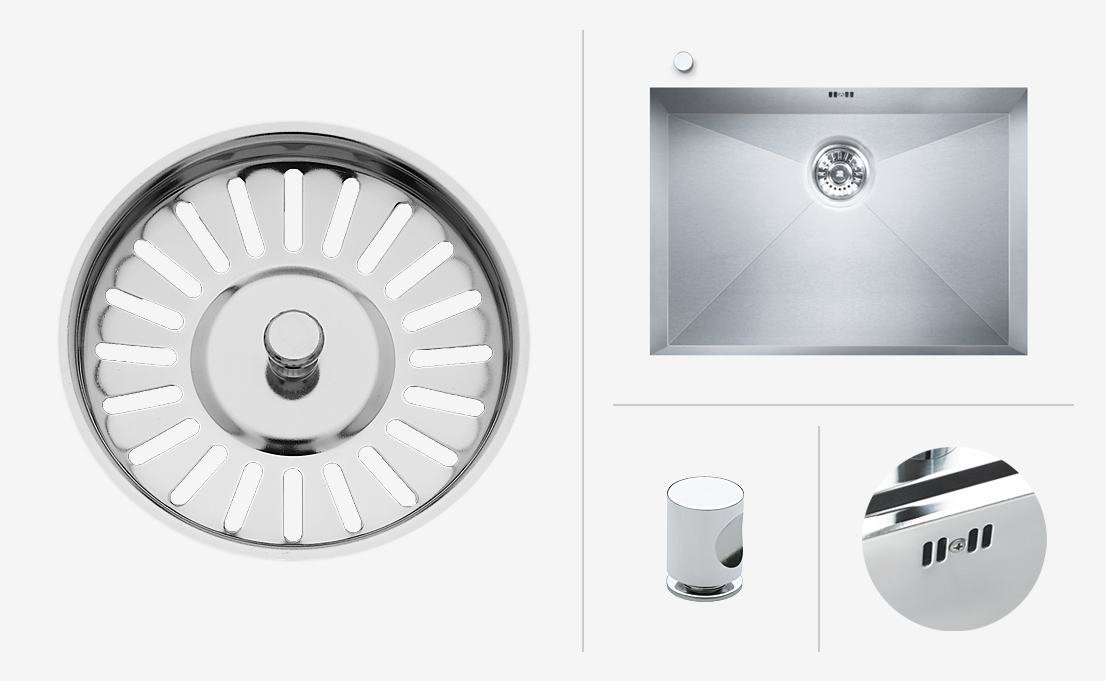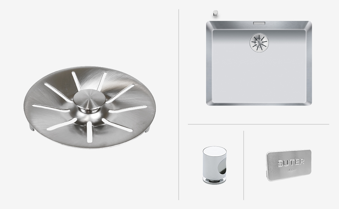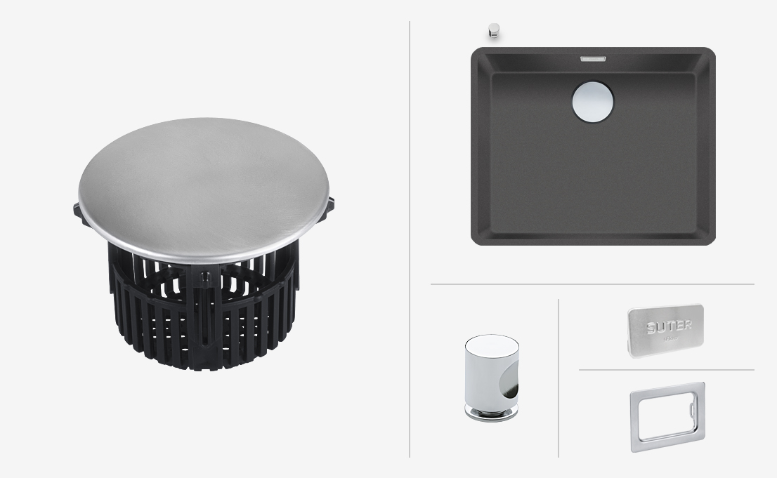 Ergänzt wird das Wasserzentrum durch einen Siebkorb und einen verdeckten Überlauf. Je nach Becken- oder Spülenmodell unterscheiden sich diese in Form und Farbe.