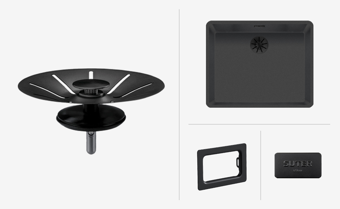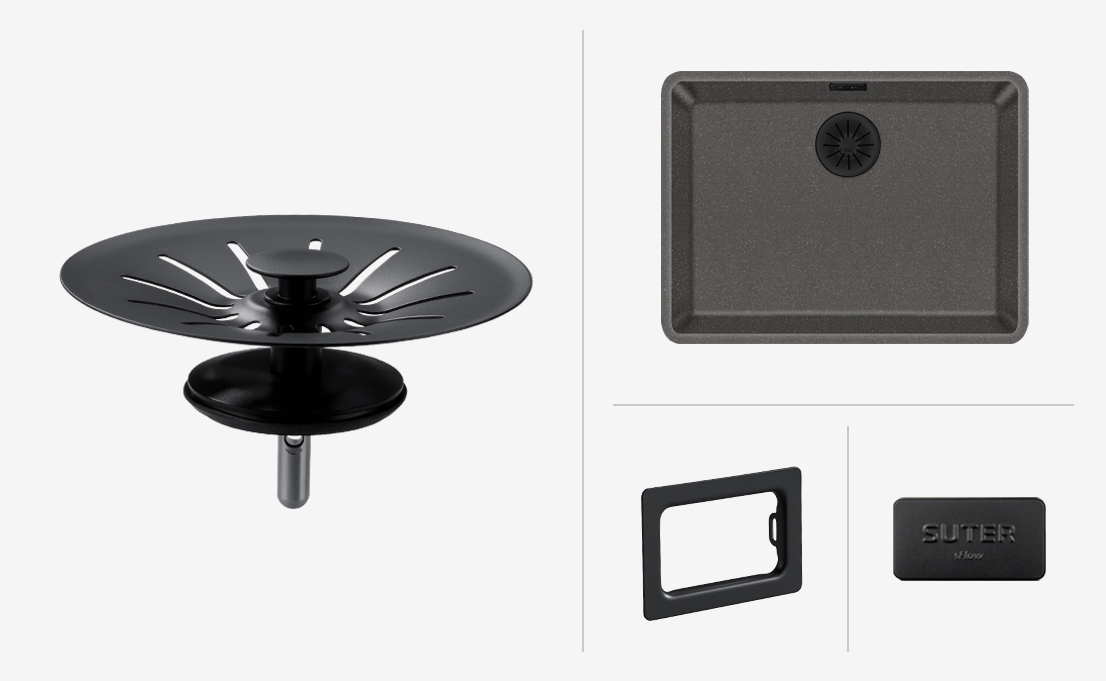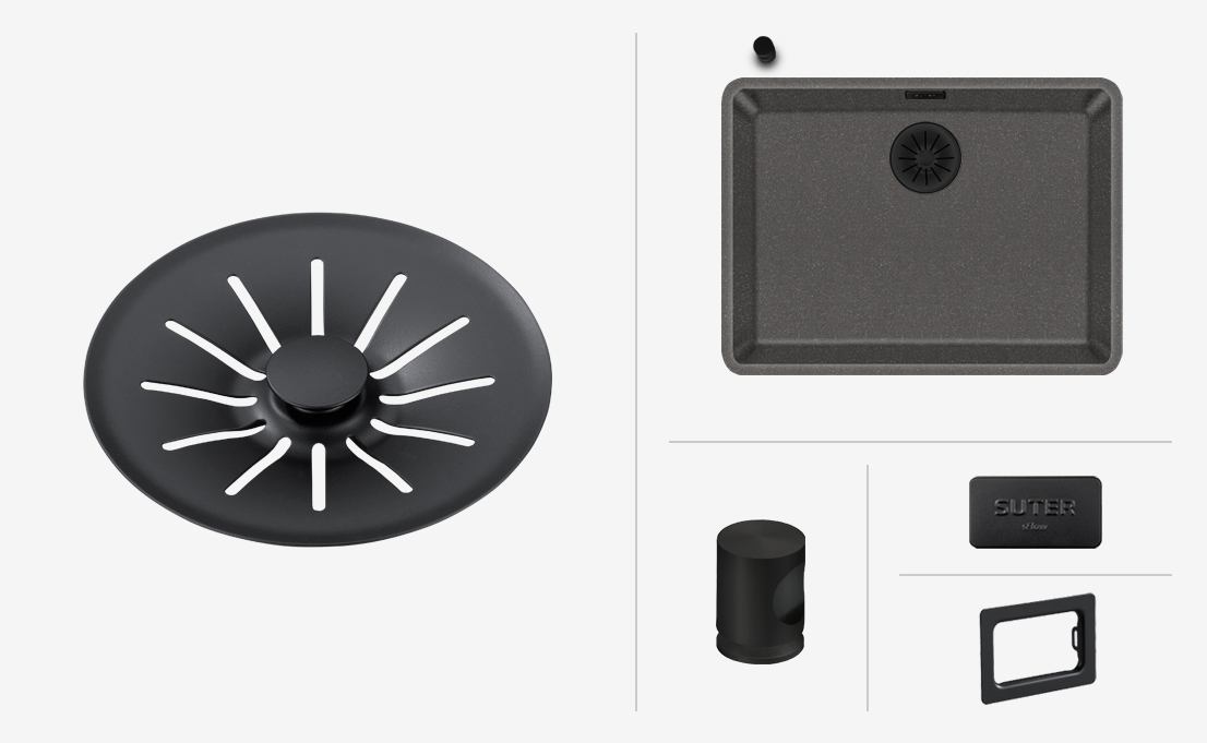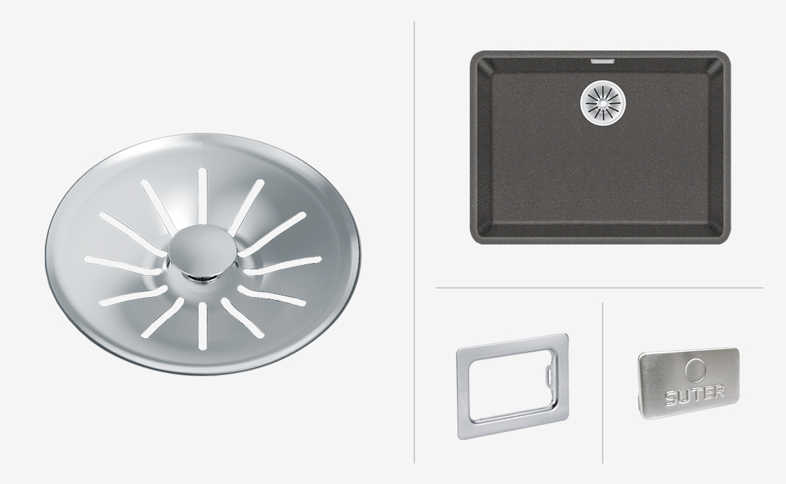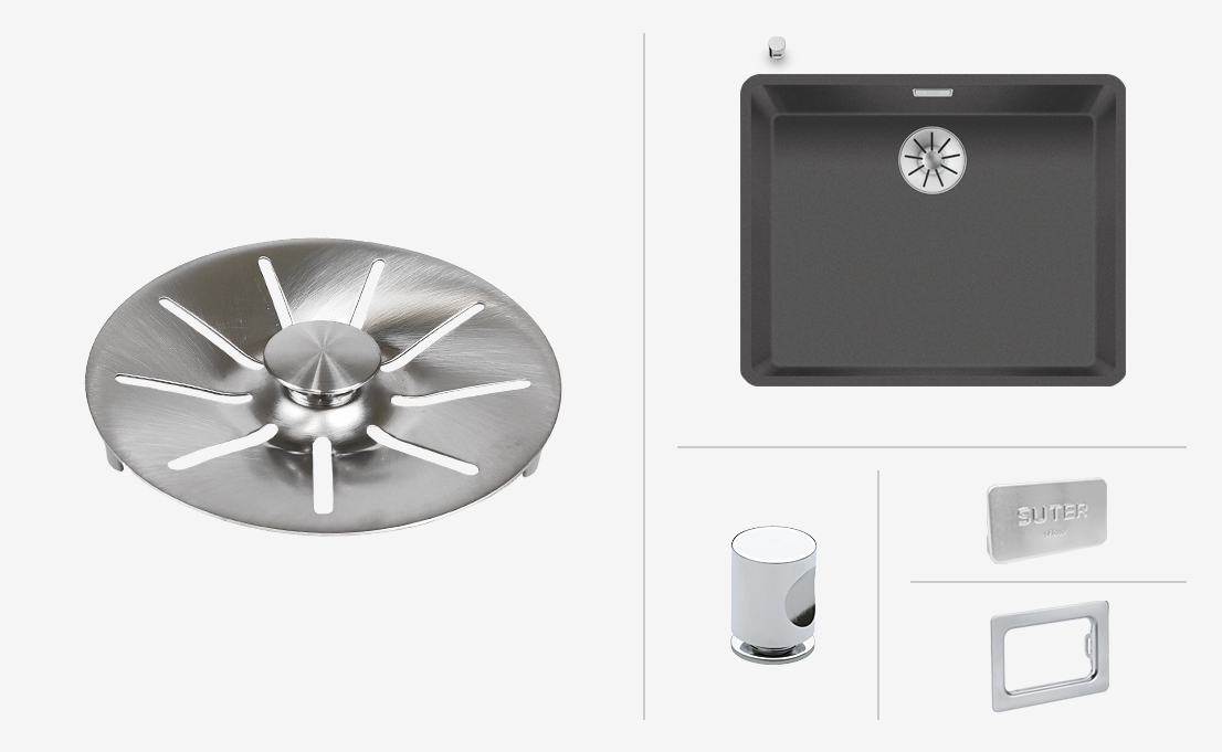 Ergänzt wird das Wasserzentrum durch einen Siebkorb und einen verdeckten Überlauf. Je nach Becken- oder Spülenmodell unterscheiden sich diese in der Farbe.