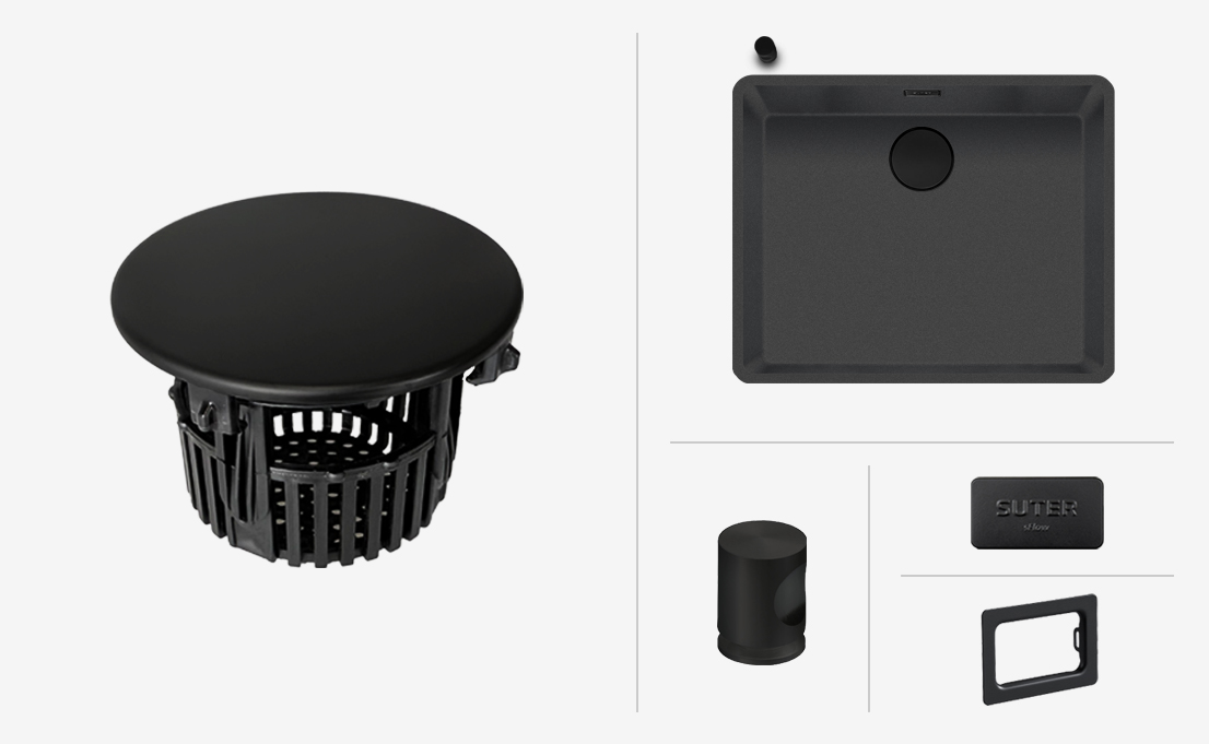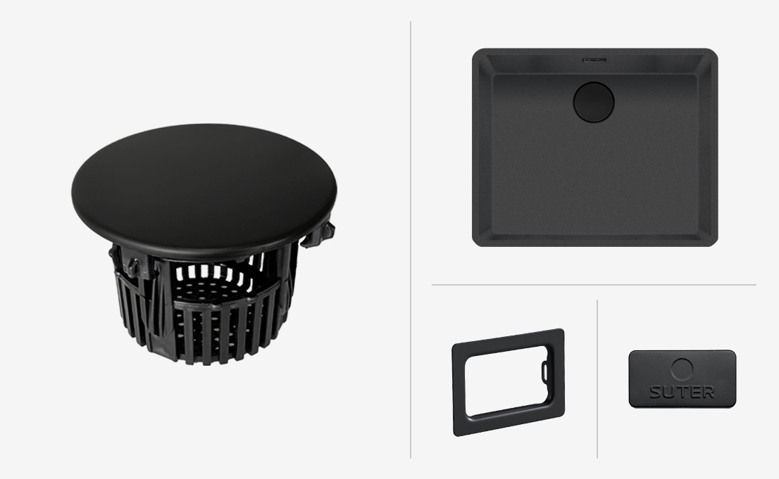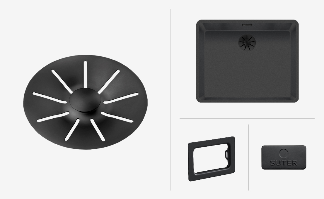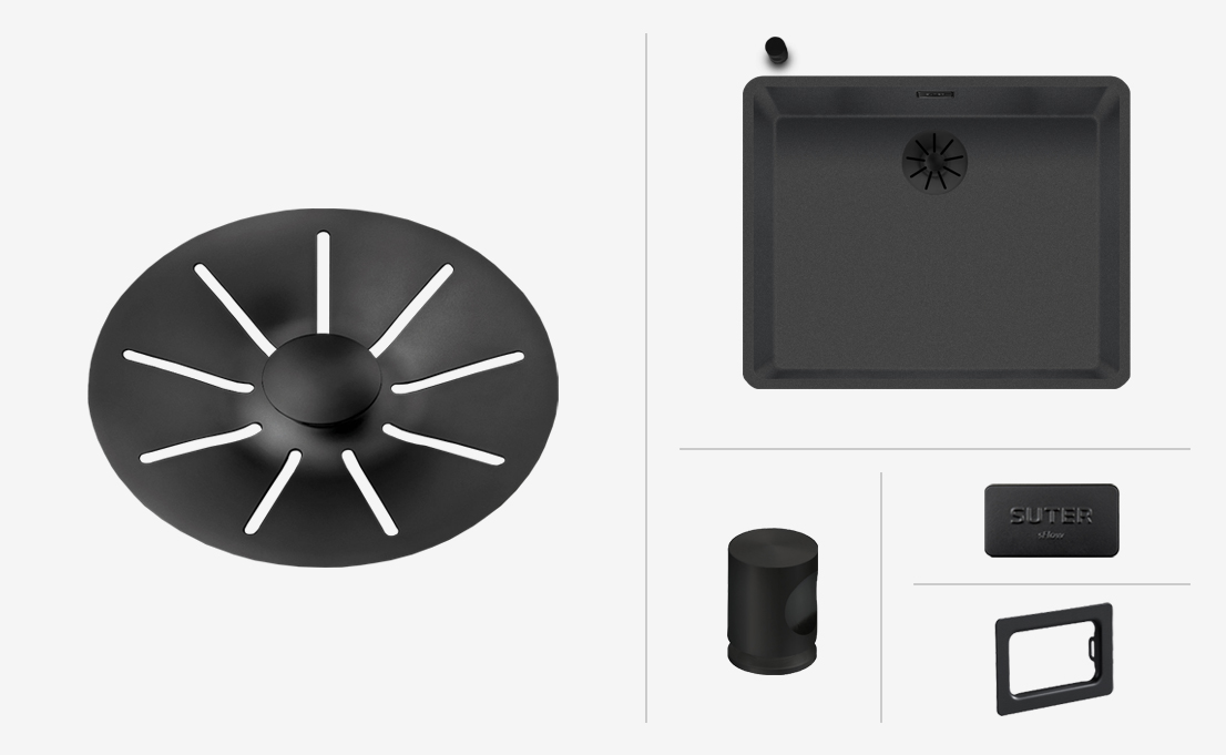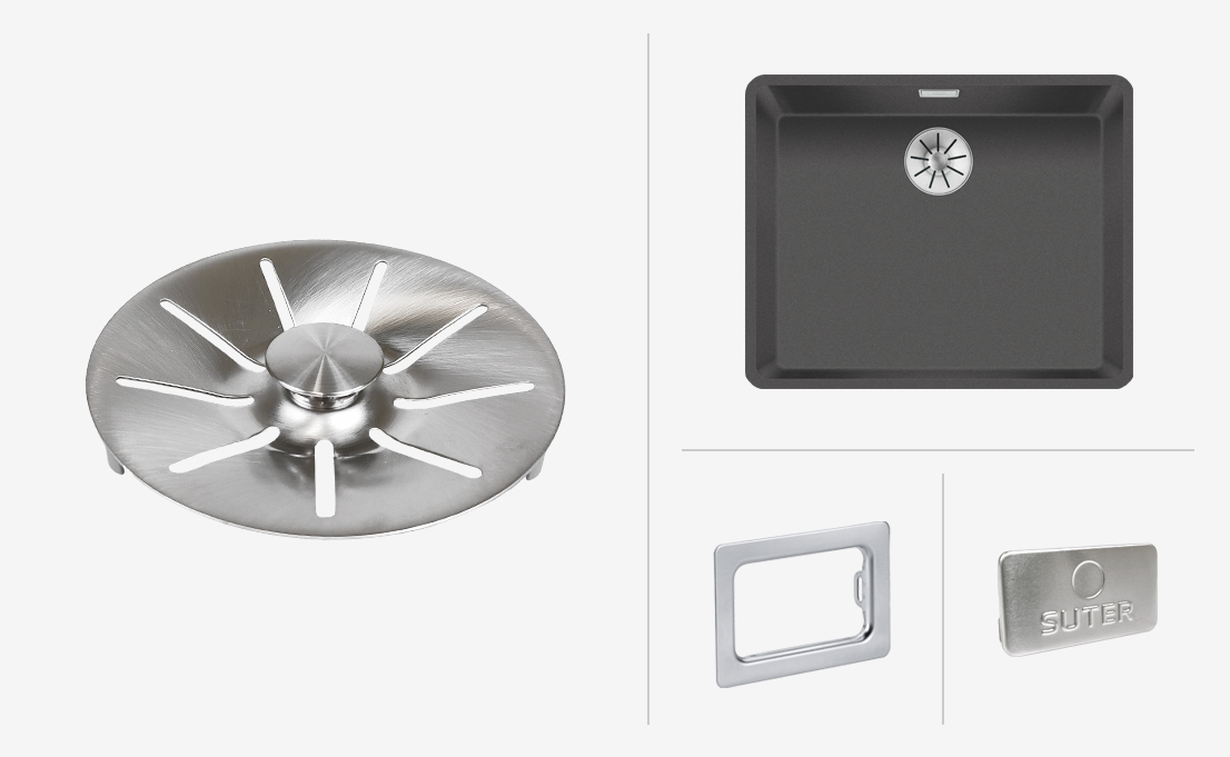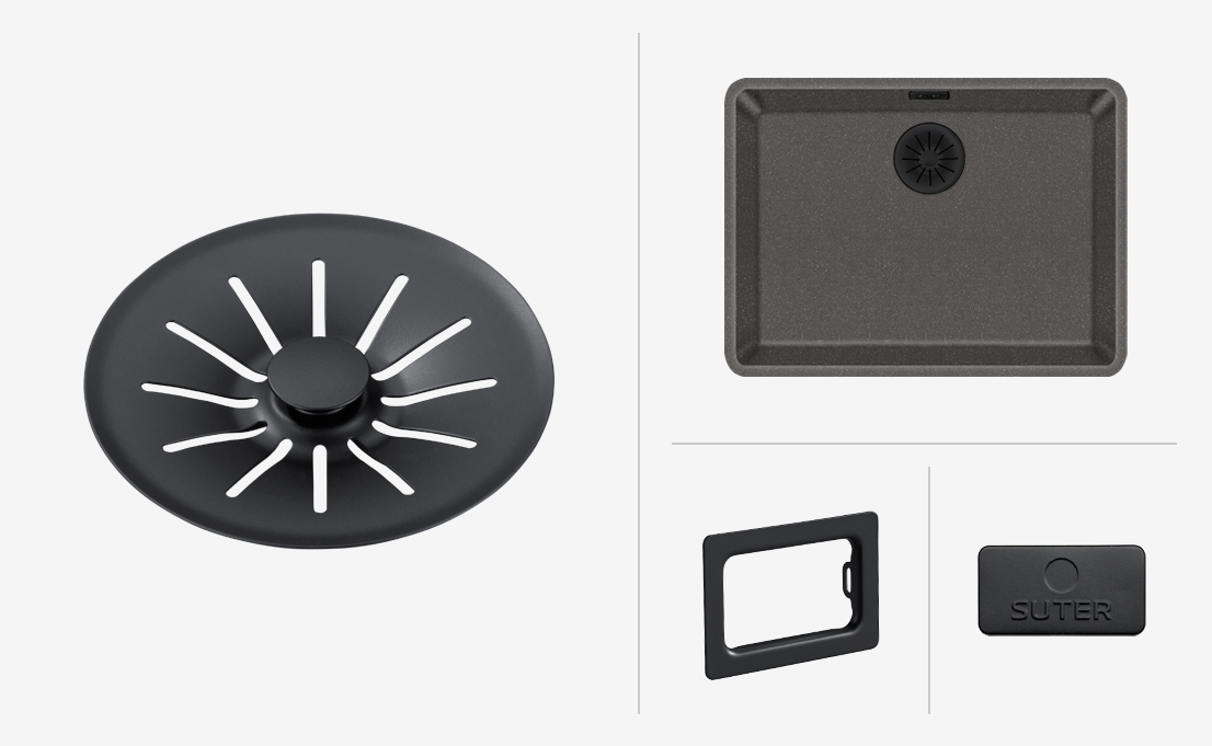 Ergänzt wird das Wasserzentrum durch einen Siebkorb und einen verdeckten Überlauf. Je nach Becken- oder Spülenmodell unterscheiden sich diese in der Farbe.