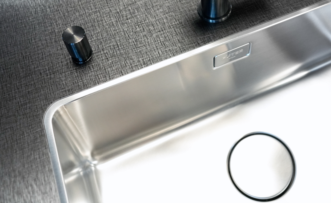 Der verdeckte Überlauf ist in zwei Farbvarianten verfügbar – Edelstahl oder schwarz matte DEC-Beschichtung – und wird bei Granitspülen mit einem Rahmen kombiniert.