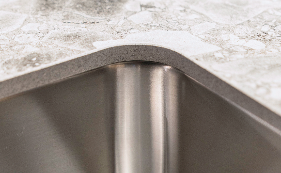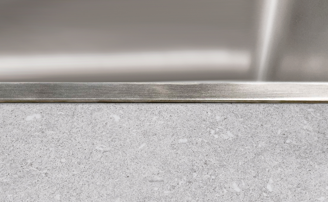Auch bei dieser Einbauvariante liegt das Augenmerk auf dem Rand der Spüle. Dieser kann je nach Modell 12 oder 15 mm sein. Zwischen Arbeitsplatte und Spüle gibt es einen sanften Kantenübergang.