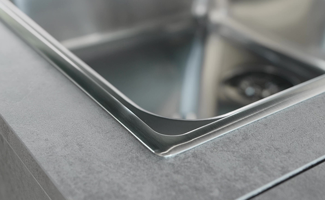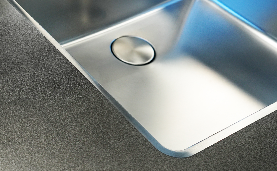 Bestehen die Küchenarbeitsplatte und das Becken aus Edelstahl, kann das Becken direkt mit der Oberfläche verbunden werden. Flächenbündig eingeschweisst aus einer Hand bleibt das Wasserzentrum nachhaltig hygienisch und reinigungsfreundlich.