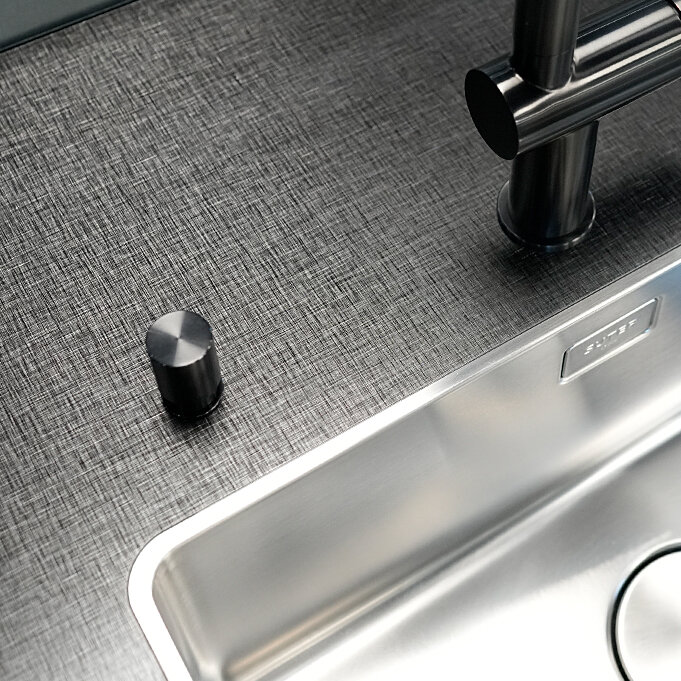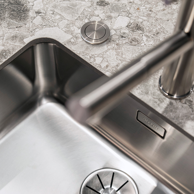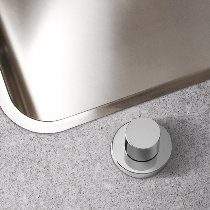 Dezent, flach, modern. Der Druckknopf ist die neuste und unauffälligste Ausführung der Bedienvariante Raumspar. Der Wasserabfluss wird durch einen Druck auf den Knopf gesteuert. Der Druckknopf lässt sich flächenbündig in die Arbeitsplatte integrieren. So entsteht eine besonders ruhige, aufgeräumte Optik, die sich perfekt in moderne Küchenkonzepte einfügt. Alternativ kann der Bedienknopf auch auf der Arbeitsplatte montiert werden und ragt dank seines flachen Designs nur minimal hervor.
