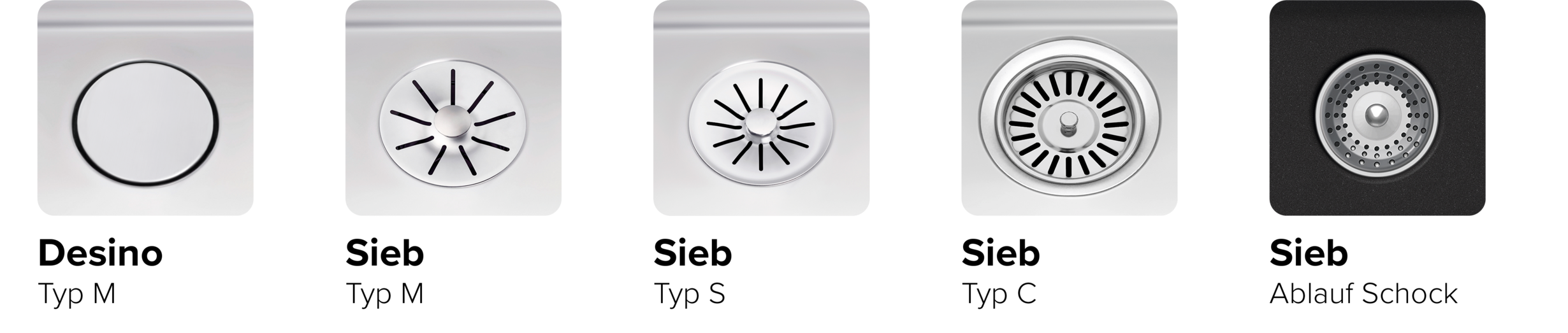 Je nach persönlicher Vorliebe, Küchendesign und Beckenmodell stehen unterschiedliche Bedienknöpfe zur Auswahl. Sie unterscheiden sich in der Art der Bedienung, im Design sowie in den Kombinationsmöglichkeiten mit Ablauftechniken und -typen.